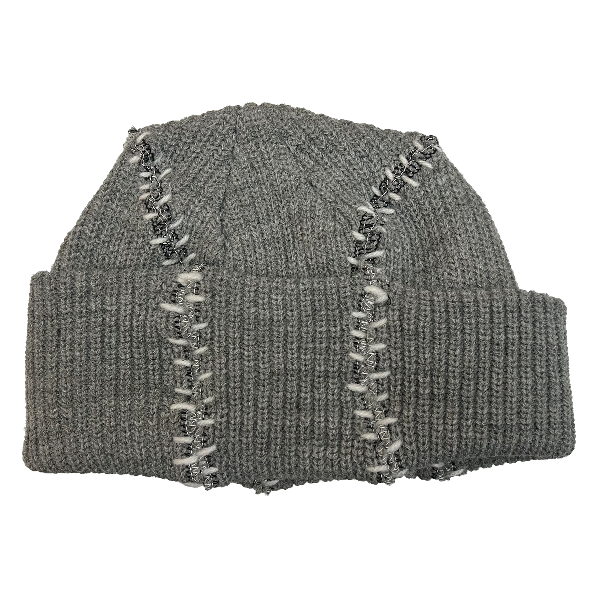 Hand Stitched Tri-Colored Beanie. Wide ribbed knit, 100% acrylic.