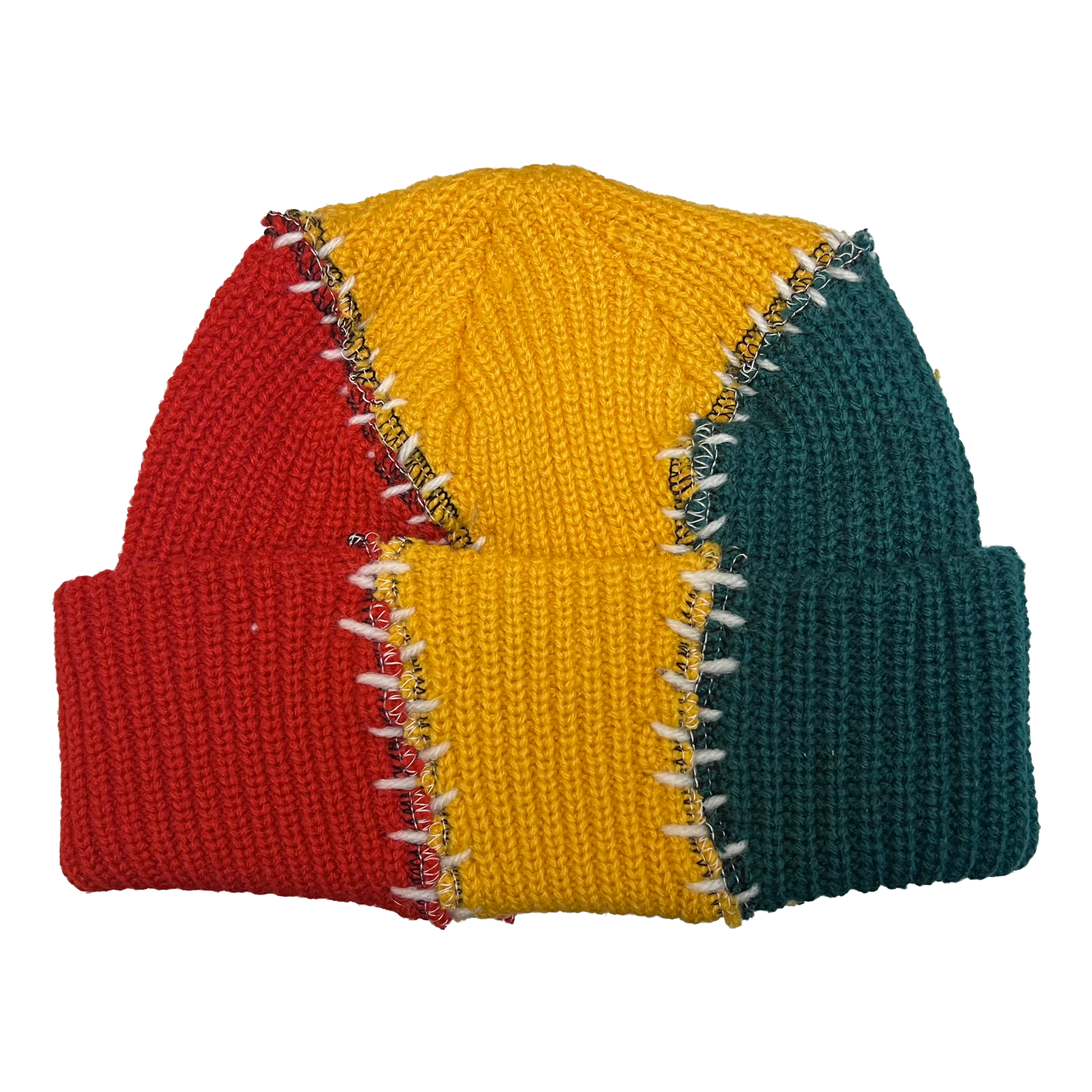 Hand Stitched Tri-Colored Beanie. Wide ribbed knit, 100% acrylic.
